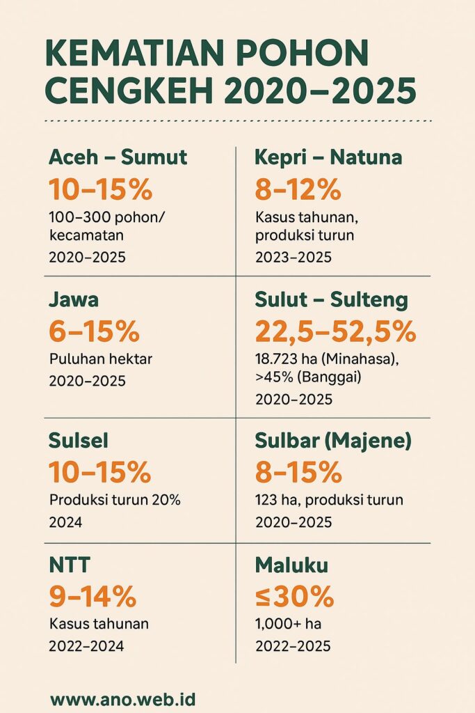 Dalam lima tahun terakhir, kondisi cengkeh nasional sebenarnya sedang menuju fase yang cukup mengkhawatirkan. Di banyak sentra produksi sperti Aceh, Sumut, Jawa, Sulawesi, Maluku, NTT, hingga Papua, tren kematian pohon terus naik dan terjadi hampir serempak. Penyebabnya bukan lagi faktor tunggal, tapi kombinasi yang saling menguatkan: kebun-kebun tua yang tidak diremajakan, perawatan yang makin jarang, serta musim basah panjang yang mempercepat serangan penggerek batang.